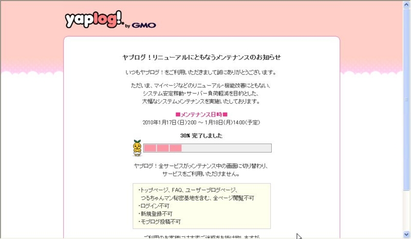 ヤプログが大幅メンテナンス中につき、ブログを更新できず。